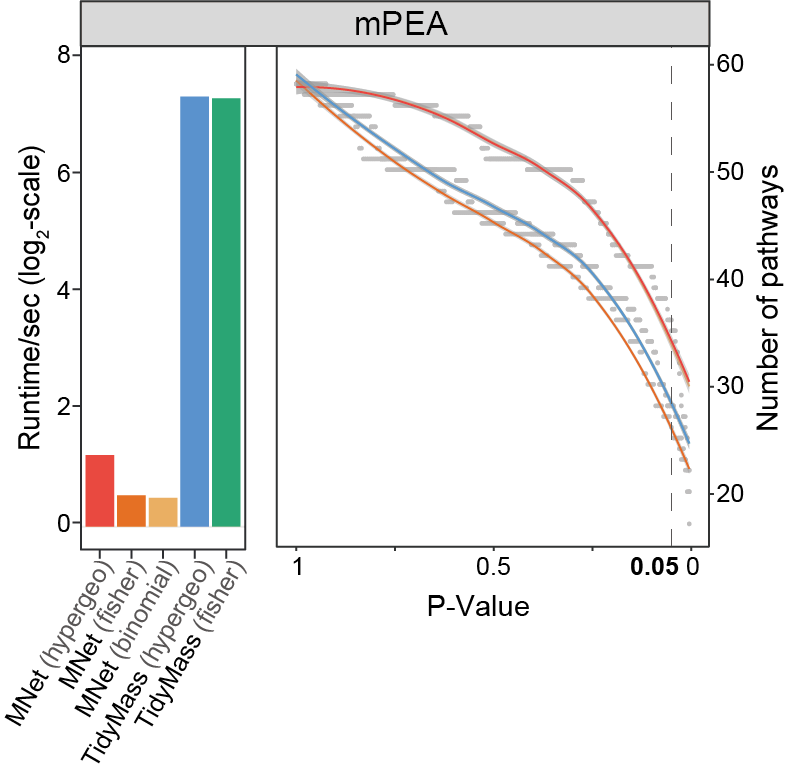 Comparison of enriched pathway counts (line plots) and computational efficiency (log₂-scale runtime bars) between MNet and TidyMass (metabolite-based).