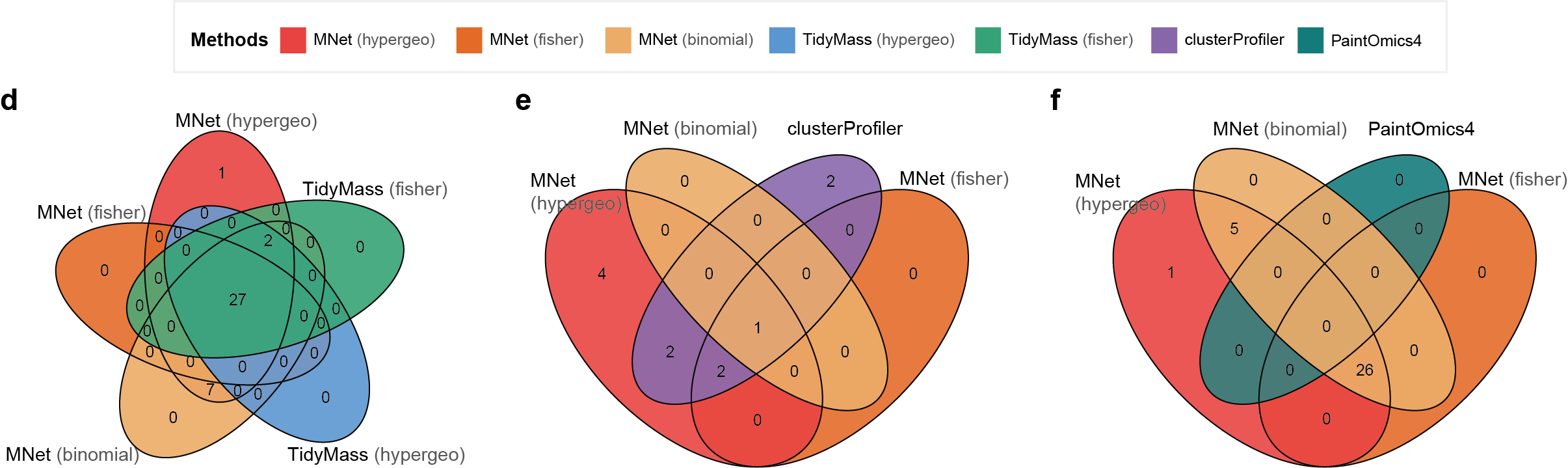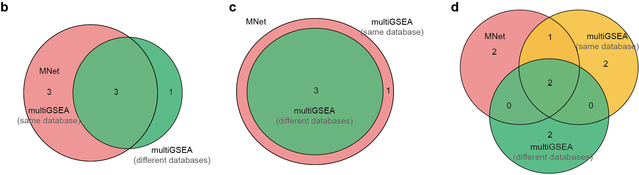 d-f. Venn diagrams of pathway overlaps for respective comparisons.