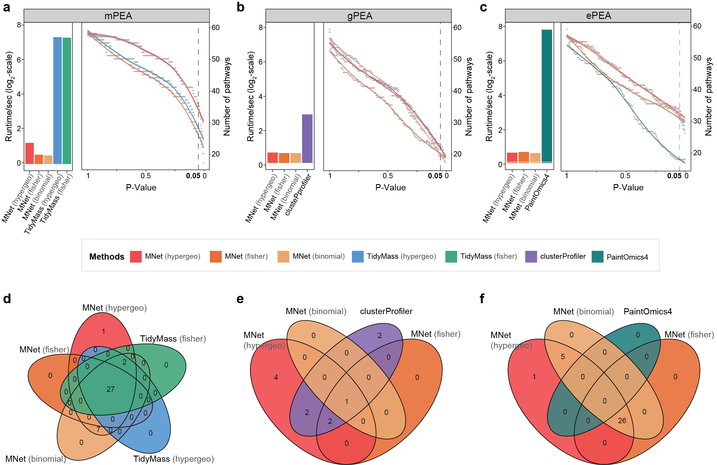 a-c. Comparison of enriched pathway counts (line plots) and computational efficiency (log₂-scale runtime bars) between MNet and: (a) TidyMass (metabolite-based), (b) clusterProfiler (gene-based), and (c) PaintOmics (integrated).
