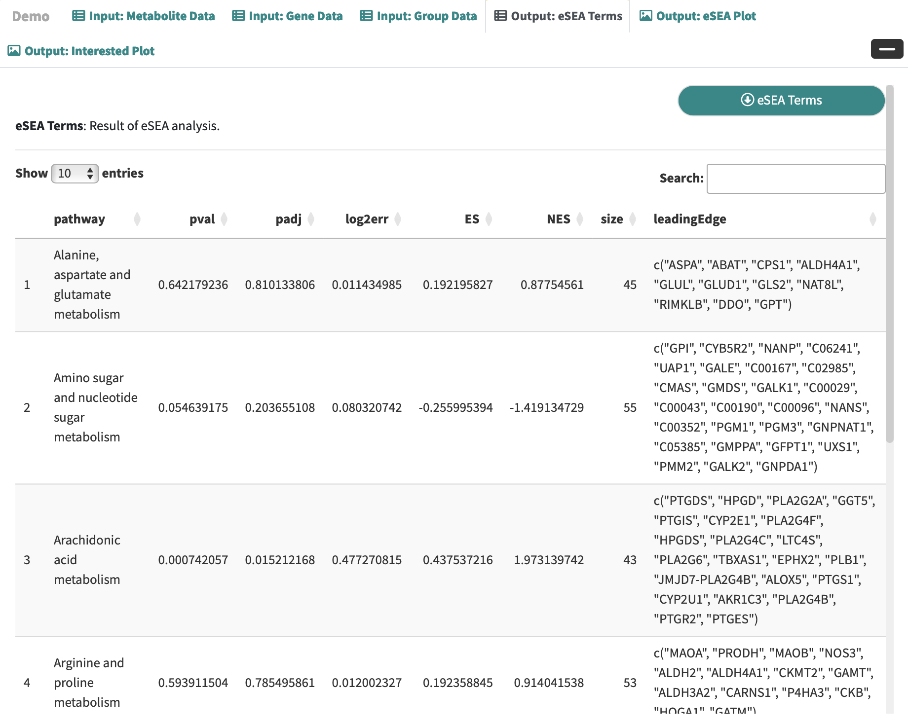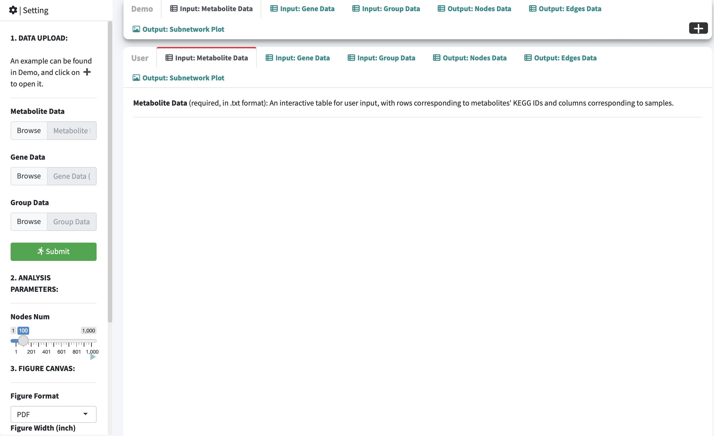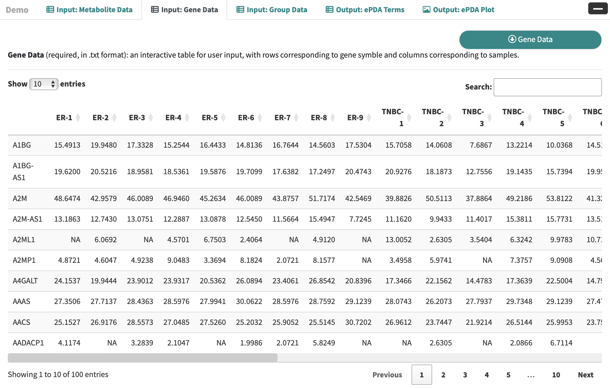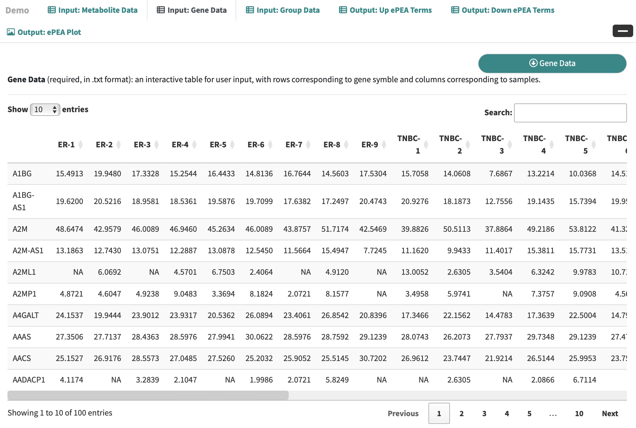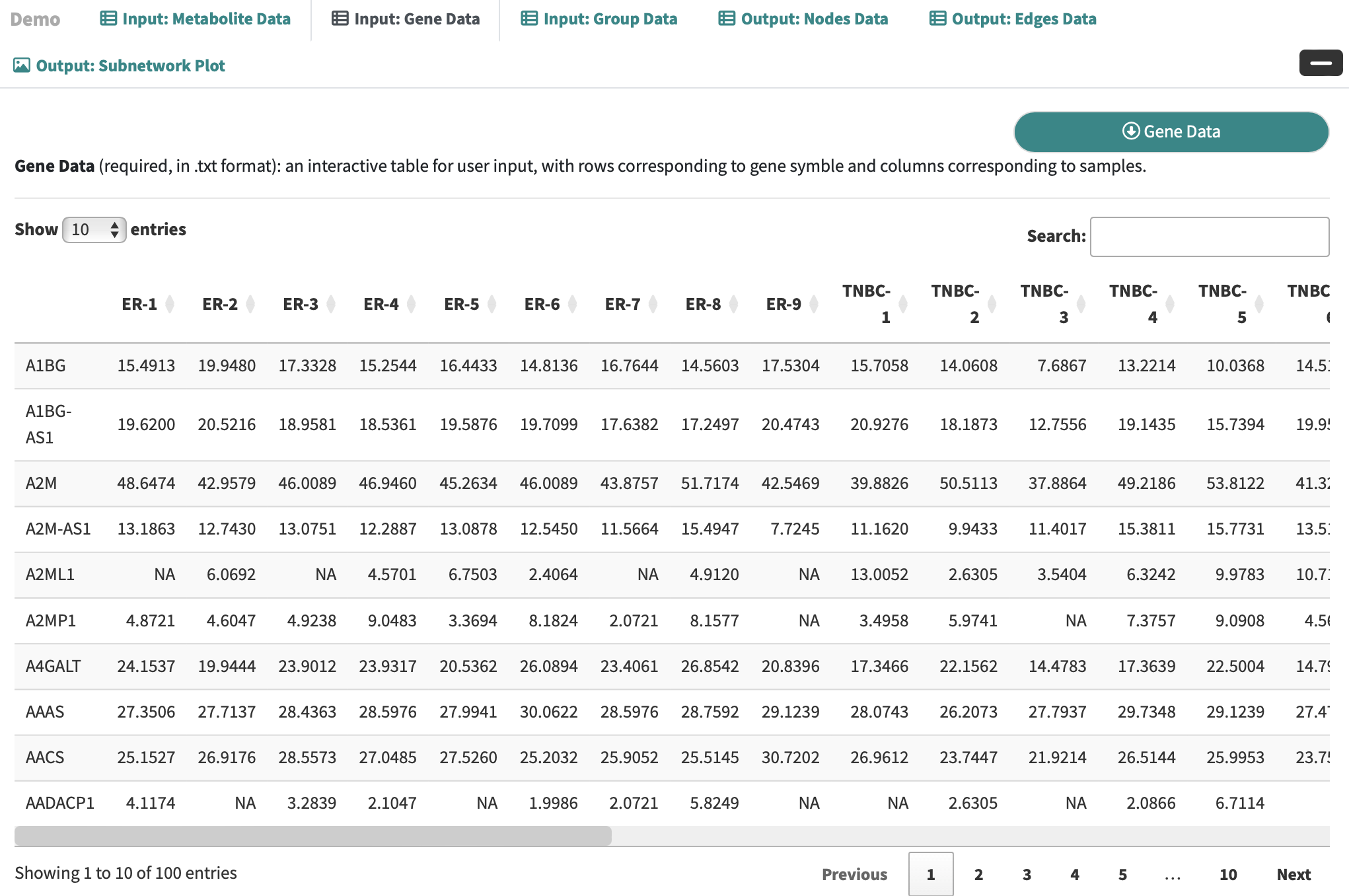 Gene Data: an interactive table for user-input metabolic data with rows corresponding to genes and columns correspond to the samples.