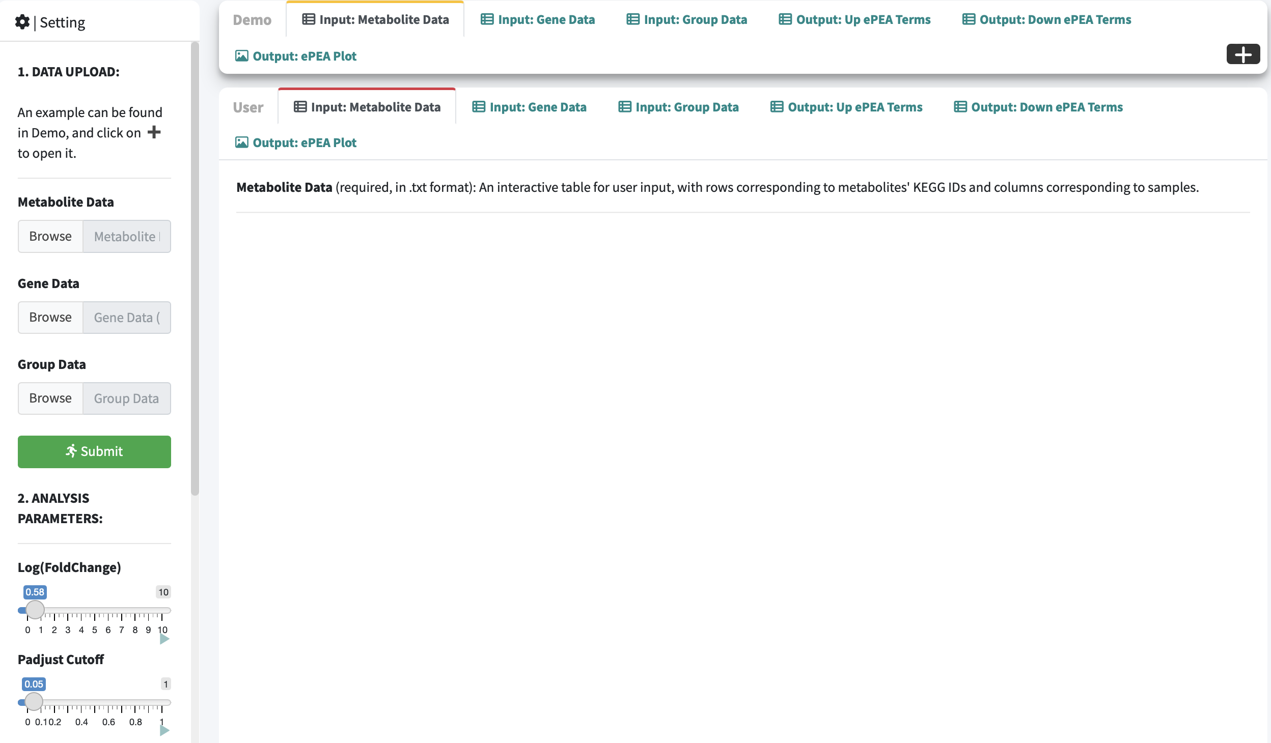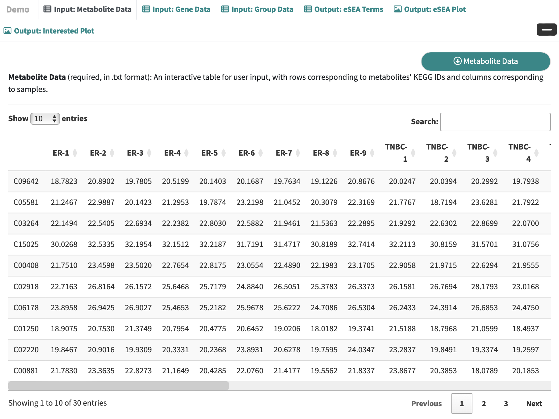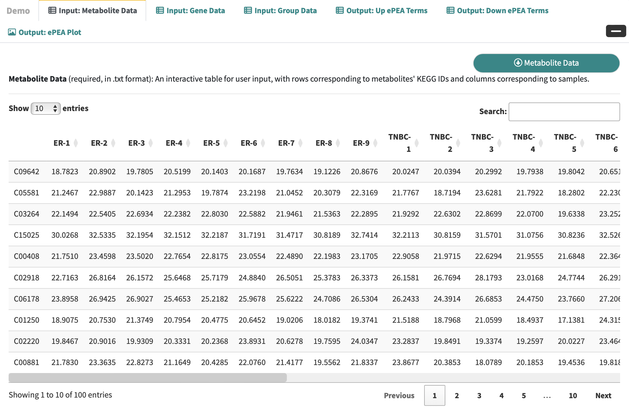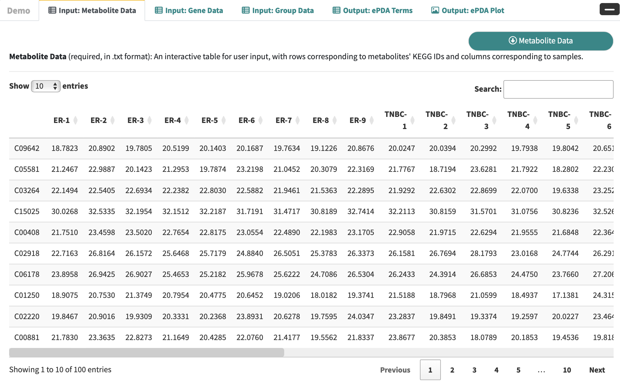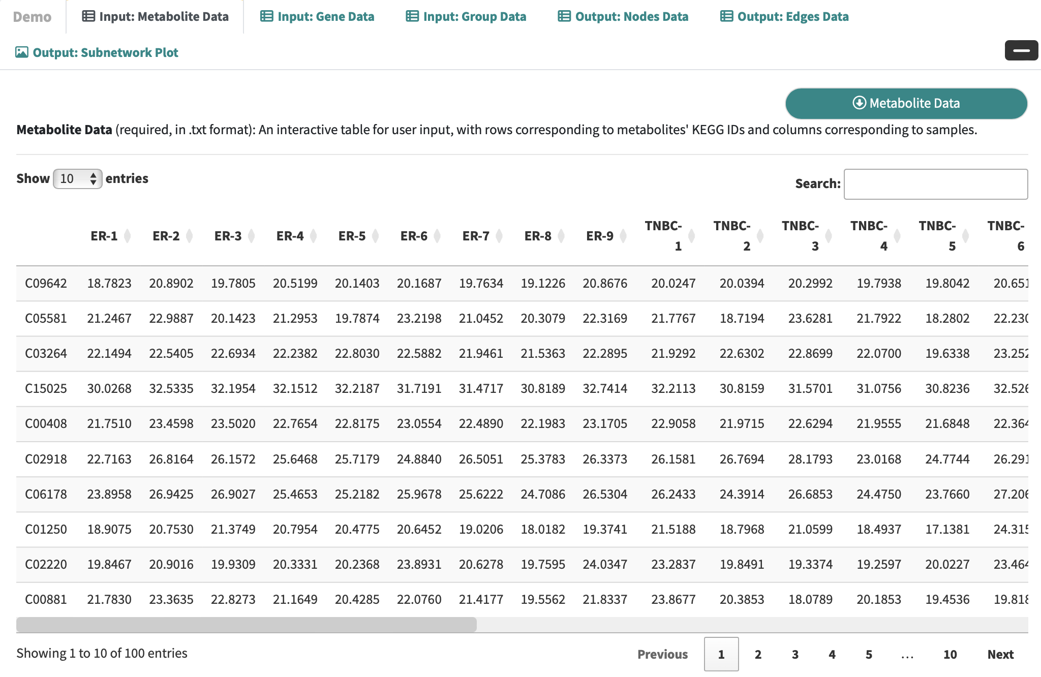Expand the Demo Panel and click Metabolic Data to download demo data, which comprises an integrated analysis of metabolomic and transcriptomic profiles in triple-negative breast cancer.