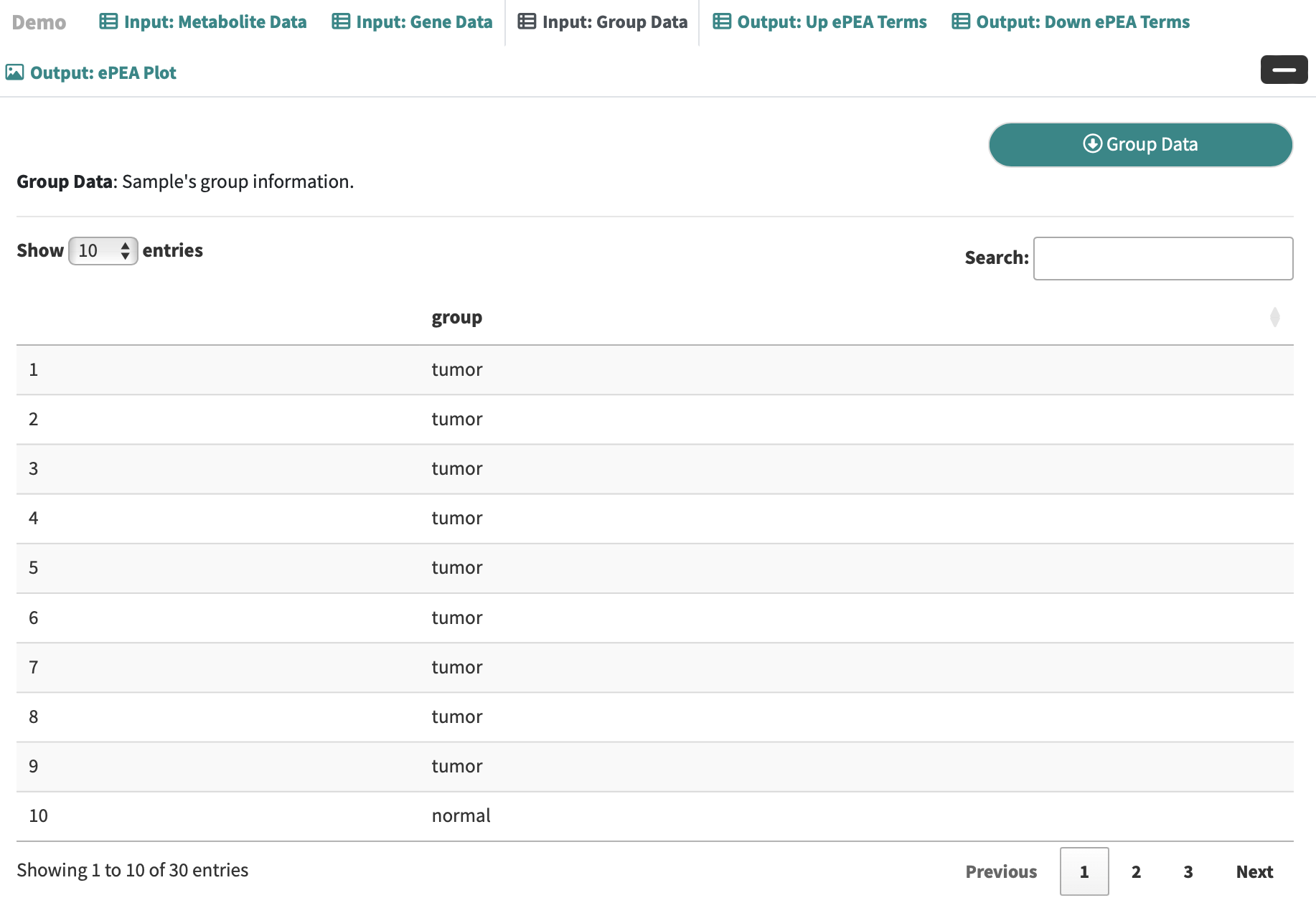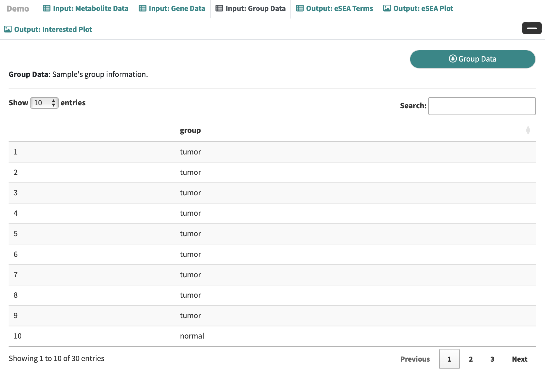 Step 1: Enter Metabolite Data, GeneExp Data and Group Data, respectively.